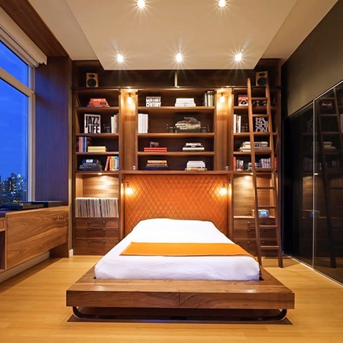 - The ladder by my wall unit. That’s made out of solid whole grain American walnut. It serves a purpose to reach the top shelf, but a lot of that is aesthetic because I think it’s very pleasant to look at and it shows timeless sophistication.