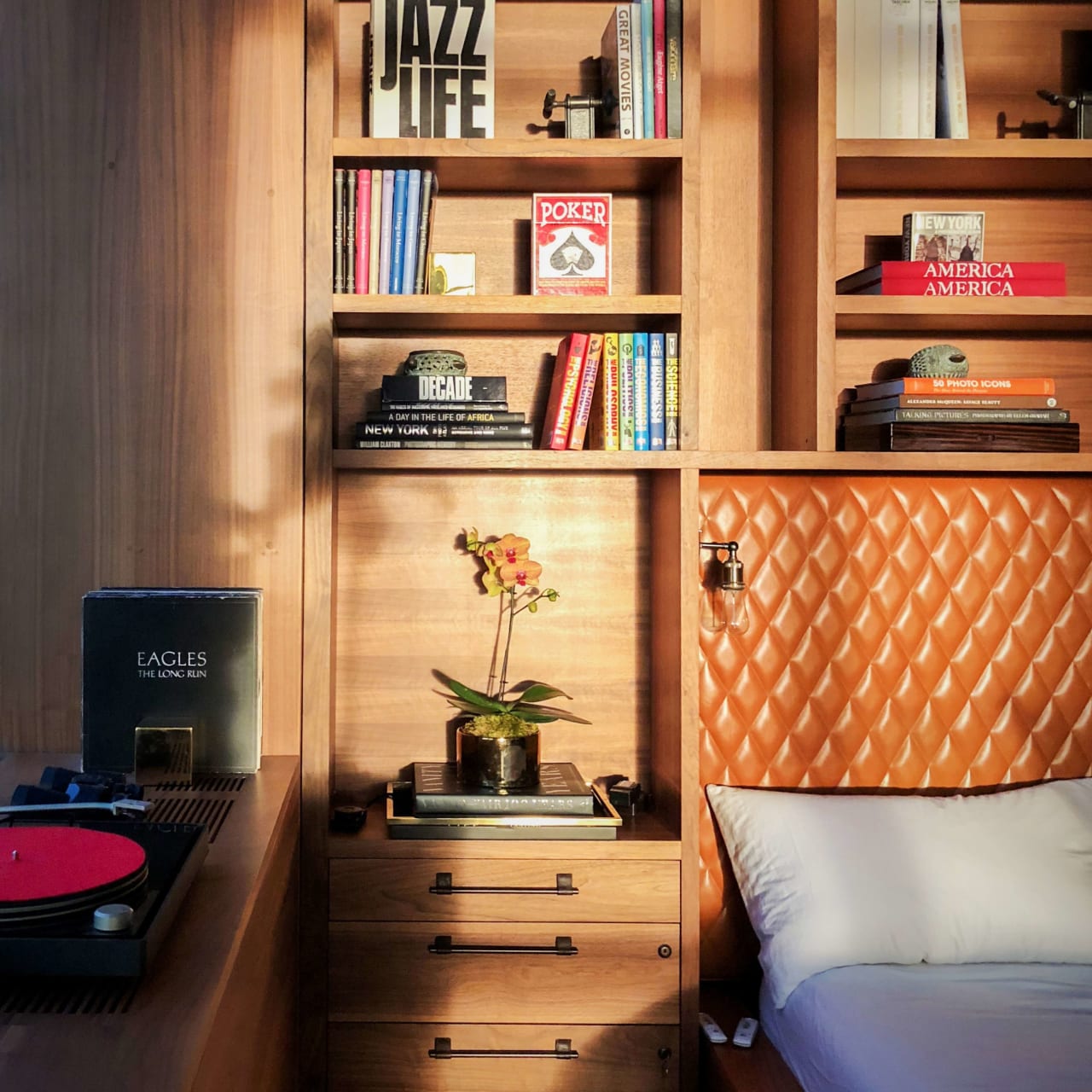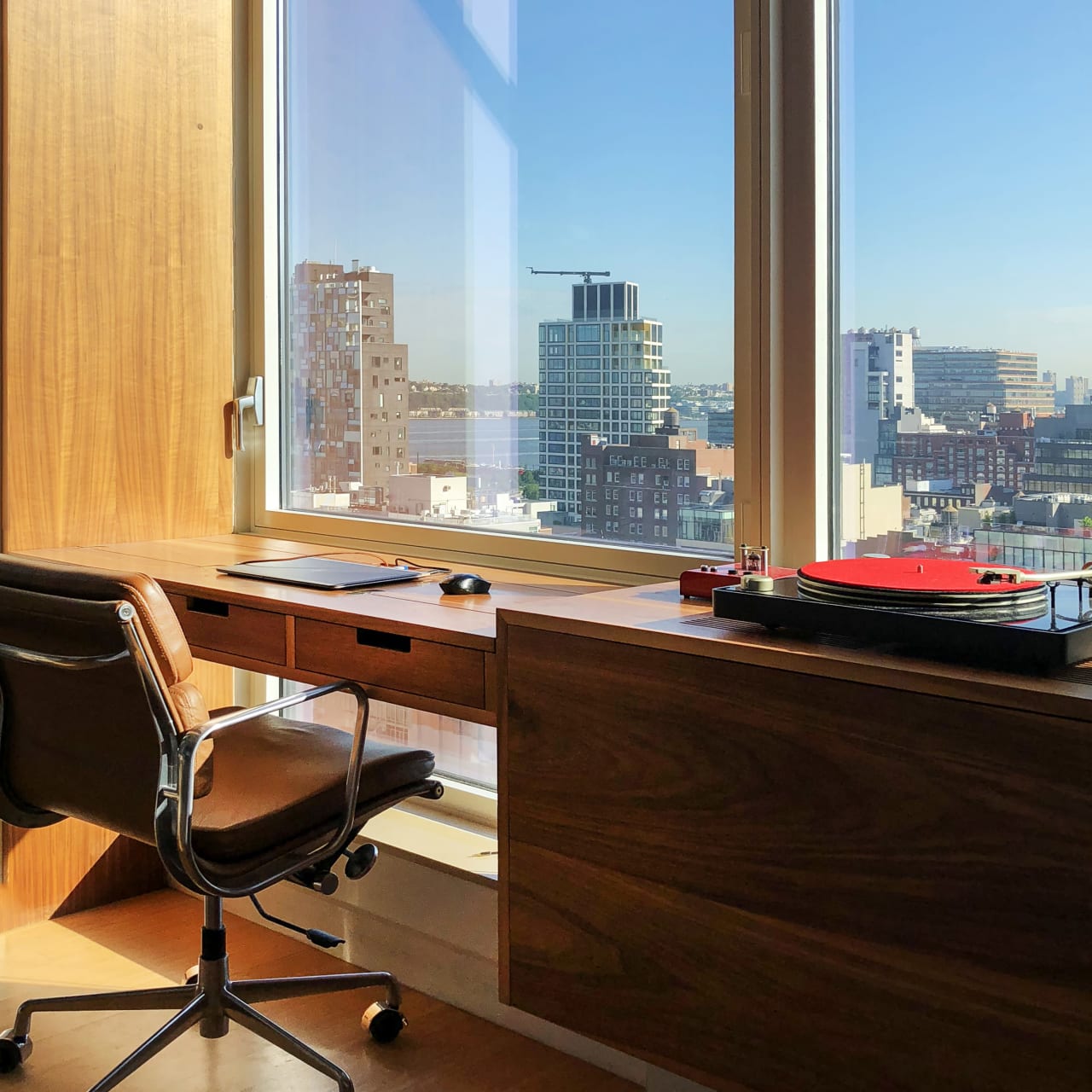 At that time, I didn’t have much design taste; I just knew what I liked based on looking at high end stuff. Over time my taste has evolved. I like pieces that are timeless and masculine, made with natural materials such as wood and glass, and with clean lines without being too modern. I also discovered walnut wood, which I love the grain and color of. Half of my apartment is full of beautiful American walnut pieces, including my wall unit, my bed, the ladder, and my office space.