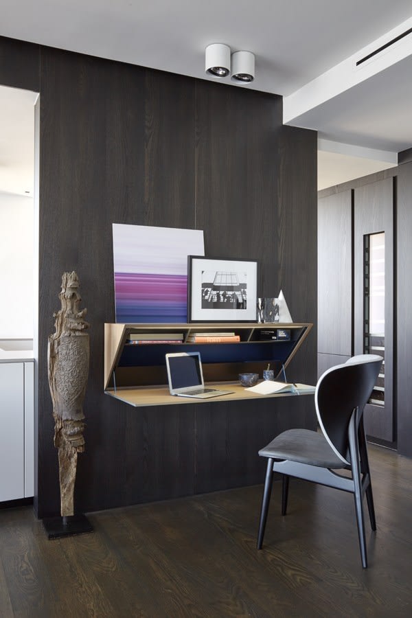 I really like the Segreto Desk by Ron Gilad (above). It’s a great solution to a hidden desk: it doesn’t look anything like a desk when it’s folded and it doesn’t take up a lot of space.