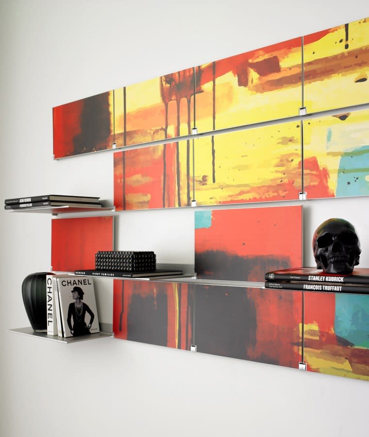 The Riveli Shelving System (above) is a shelving system on which a magnetic photo art of the clients’ choice is installed, so it serves dual purposes of shelving and art in one. It’s a great solution for small spaces and it provides an easy and budget-friendly way to switch art at any point down the line.